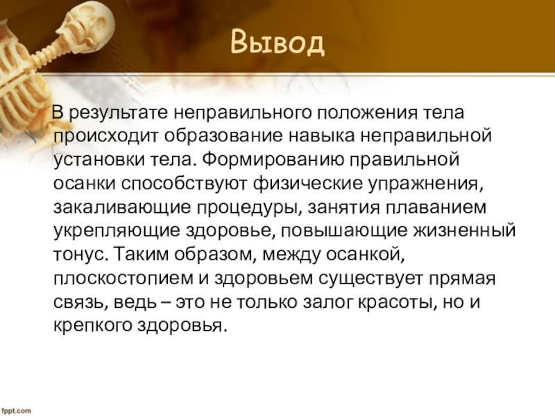 Вывод  В результате неправильного положения тела происходит образование навыка неправильной установки тела. Формированию правильной осанки способствуют