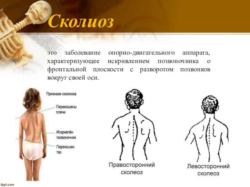 Слайд 5 Сколиоз это заболевание опорно-двигательного аппарата, характеризующее искривлением позвоночника о фронтальной плоскости с