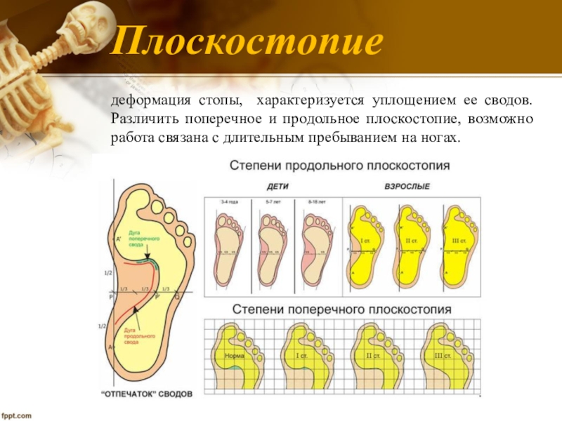 Плоскостопие    деформация стопы, характеризуется уплощением ее сводов. Различить поперечное и продольное плоскостопие, возможно работа