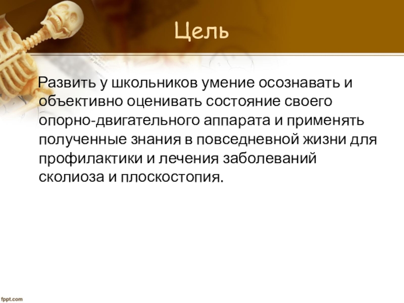 Цель Развить у школьников умение осознавать и объективно оценивать состояние своего опорно-двигательного аппарата и применять полученные знания в повседневной жизни для профилактики и лечения заболеваний сколиоза и плоскостопия.