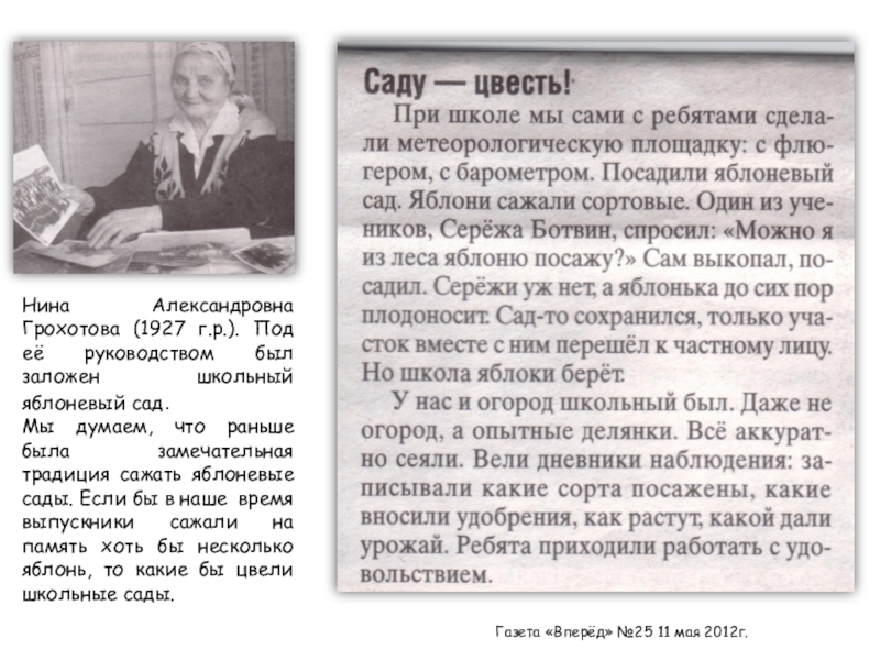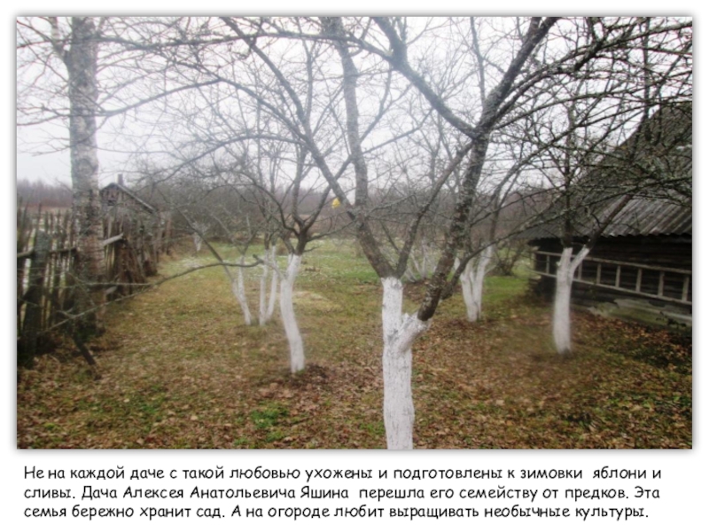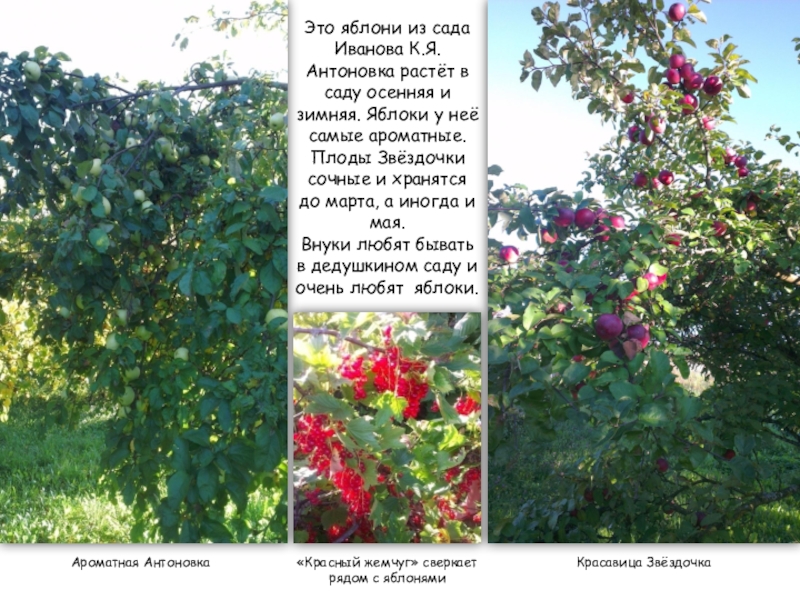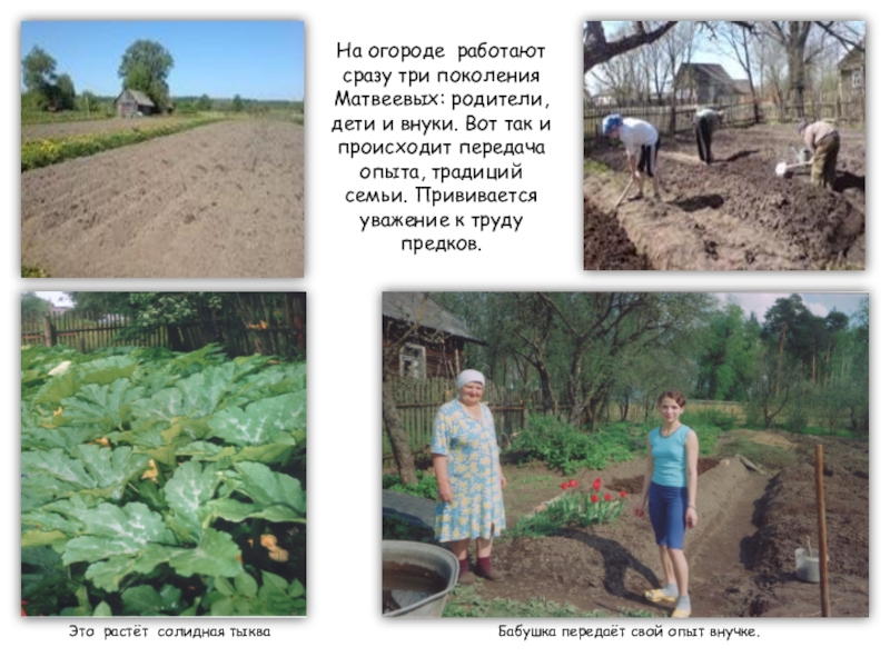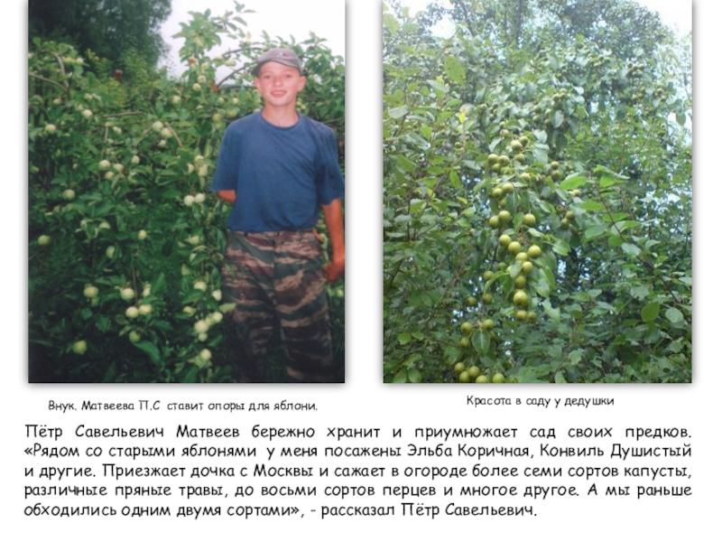 Пётр Савельевич Матвеев бережно хранит и приумножает сад своих предков. «Рядом со старыми яблонями у меня посажены Эльба Коричная, Конвиль Душистый и другие. Приезжает дочка с Москвы и сажает в огороде более семи сортов капусты, различные пряные травы, до восьми сортов перцев и многое другое. А мы раньше обходились одним двумя сортами», - рассказал Пётр Савельевич.