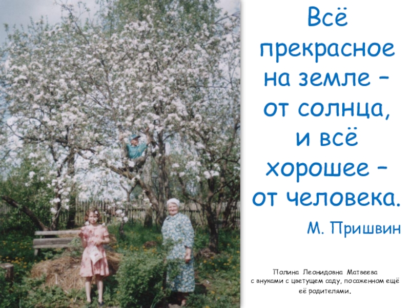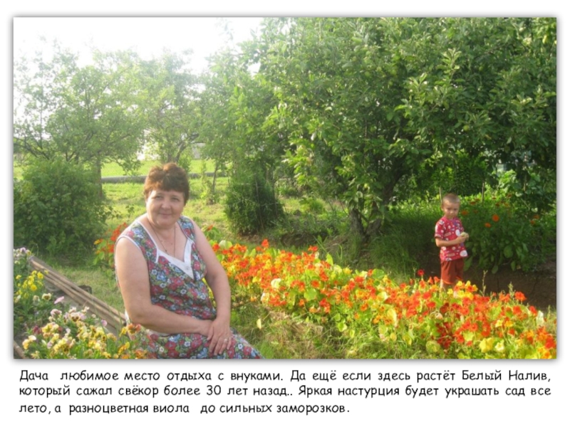 с внуками с цветущем саду, посаженном ещё её родителями.