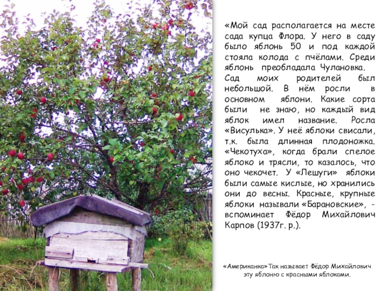 «Американка»Так называет Фёдор Михайлович эту яблоню с красными яблоками.