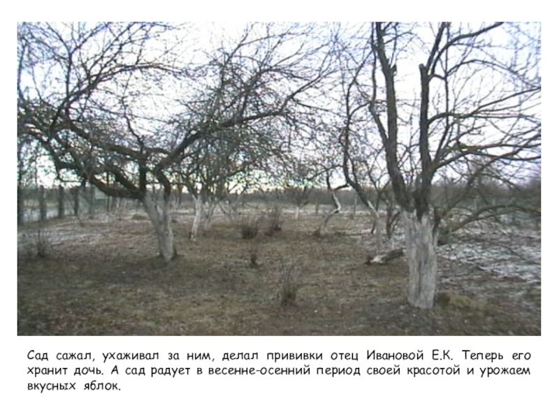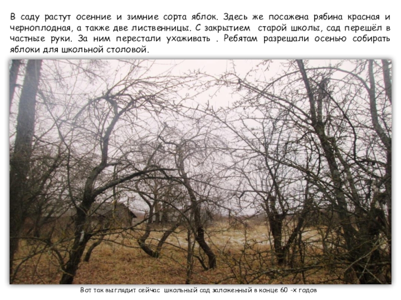 В саду растут осенние и зимние сорта яблок. Здесь же посажена рябина красная и черноплодная, а также две лиственницы. С закрытием старой школы, сад перешёл в частные руки. За ним перестали ухаживать . Ребятам разрешали осенью собирать яблоки для школьной столовой.