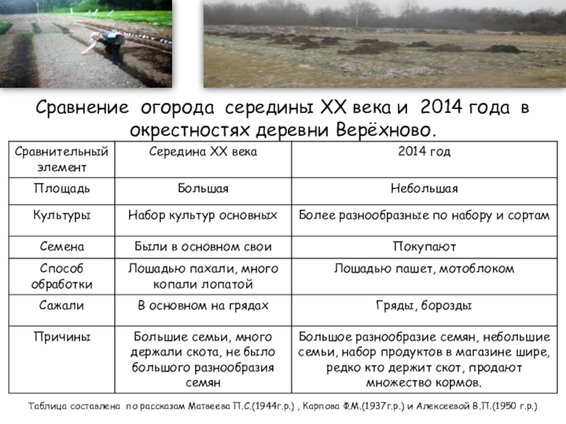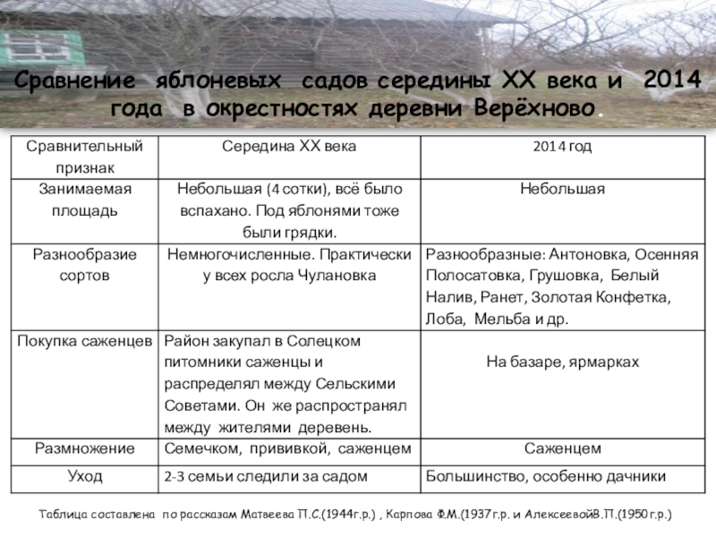 Таблица составлена по рассказам Матвеева П.С.(1944г.р.) , Карпова Ф.М.(1937г.р. и АлексеевойВ.П.(1950г.р.)