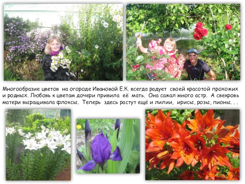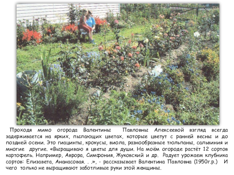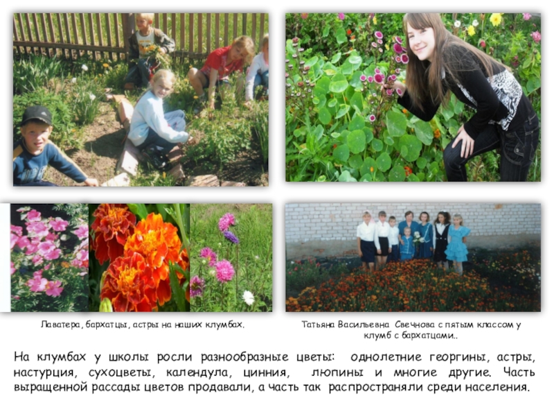 На клумбах у школы росли разнообразные цветы: однолетние георгины, астры, настурция, сухоцветы, календула, цинния, люпины и многие другие. Часть выращенной рассады цветов продавали, а часть так распространяли среди населения.