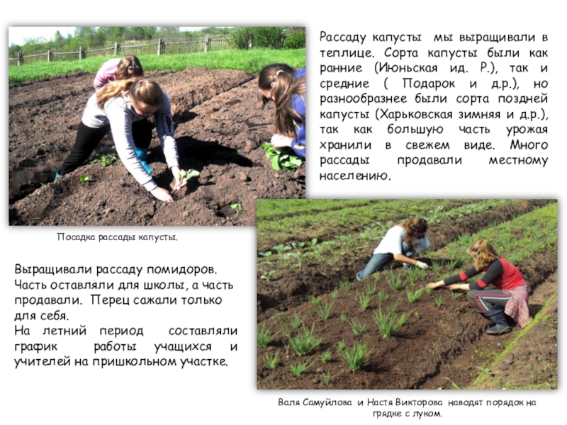 Рассаду капусты мы выращивали в теплице. Сорта капусты были как ранние (Июньская ид. Р.), так и средние ( Подарок и д.р.), но разнообразнее были сорта поздней капусты (Харьковская зимняя и д.р.), так как большую часть урожая хранили в свежем виде. Много рассады продавали местному населению.