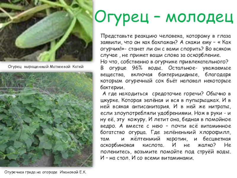 В огурце 96% воды. Остальное- уважаемые вещества, включая бактерицидные, благодаря которым огуречный сок бьёт наповал некоторые бактерии.