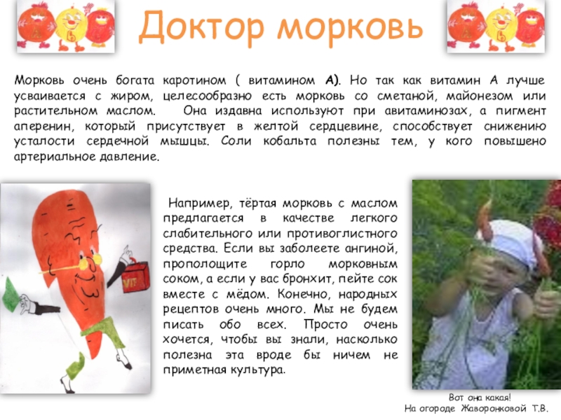 Морковь очень богата каротином ( витамином А). Но так как витамин А лучше усваивается с жиром, целесообразно есть морковь со сметаной, майонезом или растительном маслом. Она издавна используют при авитаминозах, а пигмент аперенин, который присутствует в желтой сердцевине, способствует снижению усталости сердечной мышцы. Соли кобальта полезны тем, у кого повышено артериальное давление.