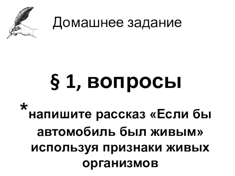 Домашнее задание§ 1, вопросы*напишите рассказ «Если бы автомобиль был живым» используя признаки живых организмов