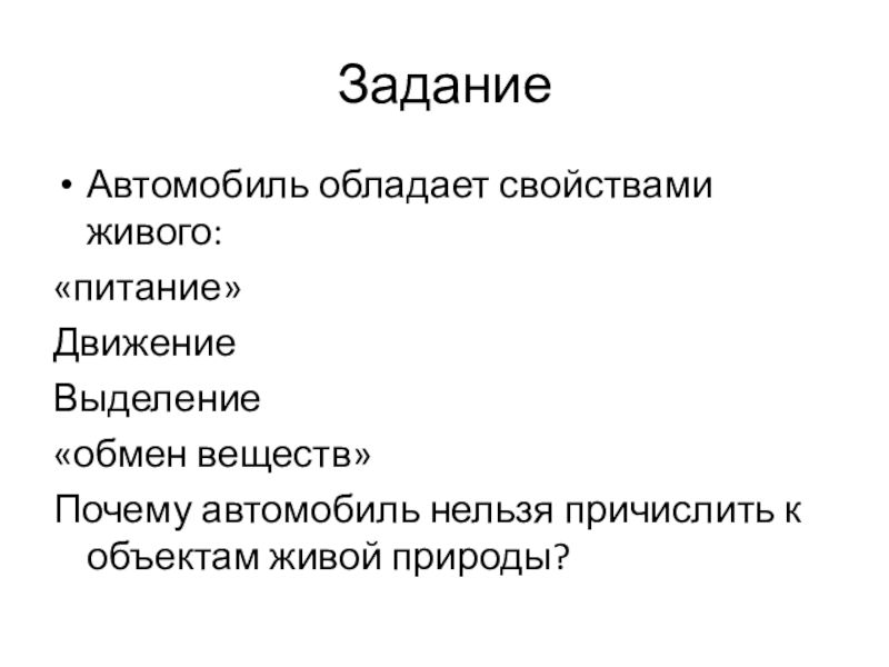 Задание Автомобиль обладает свойствами живого:«питание»ДвижениеВыделение «обмен веществ»Почему автомобиль нельзя причислить к объектам живой природы?