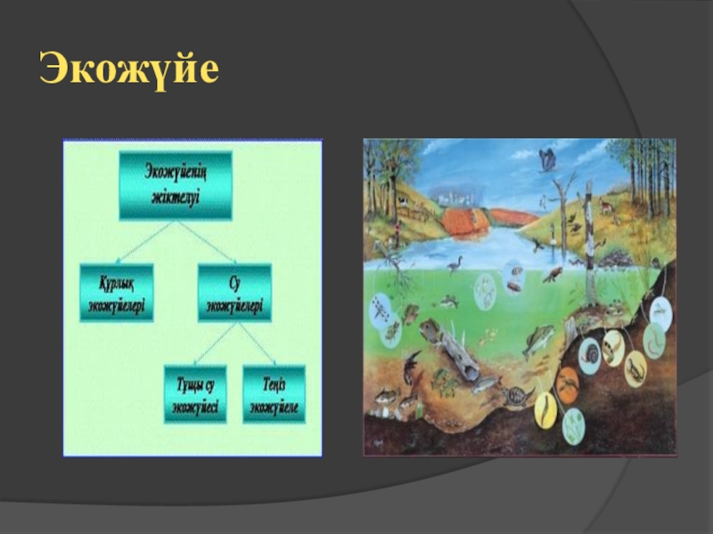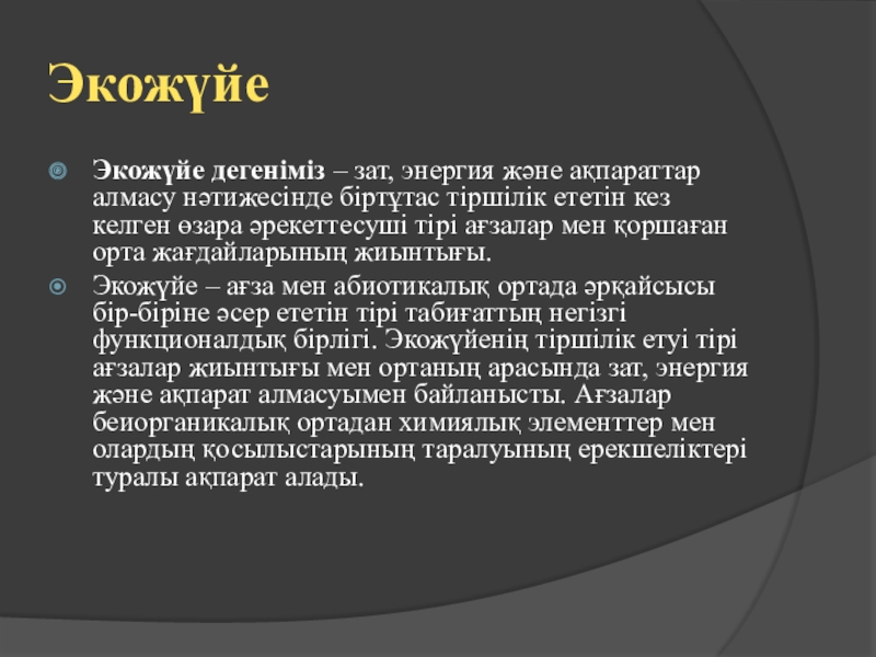 ЭкожүйеЭкожүйе дегеніміз – зат, энергия және ақпараттар алмасу нәтижесінде біртұтас тіршілік ететін кез келген өзара әрекеттесуші тірі ағзалар мен қоршаған орта жағдайларының жиынтығы.Экожүйе – ағза мен абиотикалық ортада әрқайсысы бір-біріне әсер ететін тірі табиғаттың негізгі функционалдық