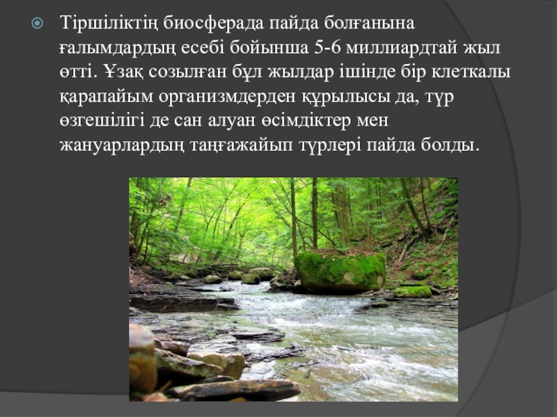 Слайд 6Тіршіліктің биосферада пайда болғанына ғалымдардың есебі бойынша 5-6 миллиардтай жыл өтті.