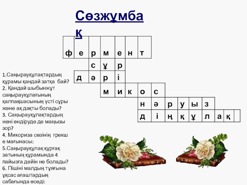 Сөзжұмбақ 	       1.Саңырауқұлақтардың құрамы қандай затқа бай?2. Қандай шыбынжұт саңырауқұлағының