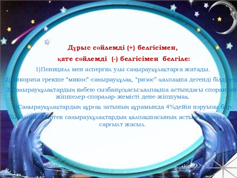 Дұрыс сөйлемді (+) белгісімен, қате сөйлемді (-) белгісімен белгіле:1)Пеницилл мен аспергил улы саңырауқұлақтарға жатады.2)Микориза грекше “микос”-саңырауқұлақ, “ризос”-қалпақша