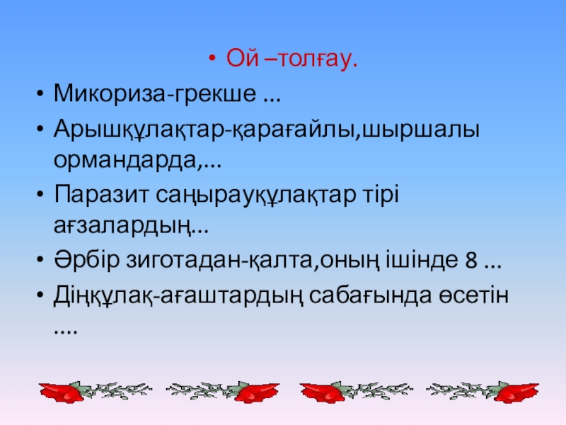 Ой –толғау.Микориза-грекше ...Арышқұлақтар-қарағайлы,шыршалы ормандарда,...Паразит саңырауқұлақтар тірі ағзалардың...Әрбір зиготадан-қалта,оның ішінде 8 ...Діңқұлақ-ағаштардың сабағында өсетін ....
