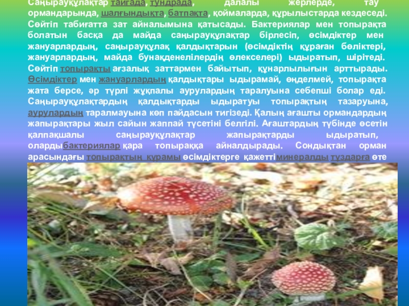 Слайд 4Саңырауқұлақтар тайгада, тундрада, далалы жерлерде, тау ормандарында, шалғындықта, батпақта, қоймаларда, құрылыстарда кездеседі. Сөйтіп табиғатта зат