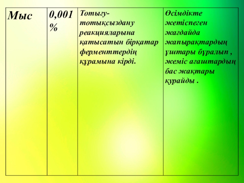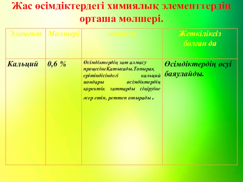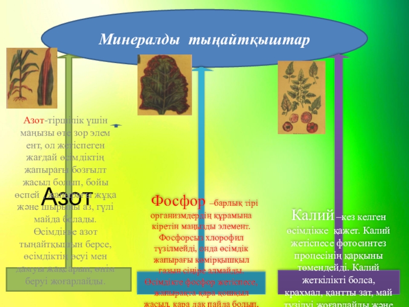 Азот-тіршілік үшін маңызы өте зор элем ент, ол жетіспеген жағдай өсімдіктің жапырағы бозғылт жасыл болып, бойы өспей , жапырағы жұқа және шырыны аз, гүлі майда болады.Өсімдікке азот тыңайтқышын берсе, өсімдіктің өсуі мен дамуы жақсарып, өнім беруі жоғарлайды.