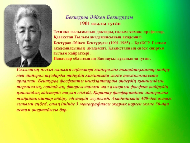 Ғалымның негізгі ғылыми еңбектері минералды тыңайтқыштар өндіру мен минерал тұздарды өңдеудің химиясына және технологиясына арналған. Бектұров фосфатты шикізаттарды өңдеудің қышқылдық, термиялық, сондай-ақ, фторсызданған мал азықтық фосфат өндірудің циклондық әдістерін тауып енгізді, Қаратау фосфоритінен минералды тыңайтқыштар өндіру әдістерін жүйеледі. Академиктің 400-ден астам ғылыми еңбегі, оның ішінде 3 монографиясы жарық көрген және 30-дан астам өнертабысы бар.