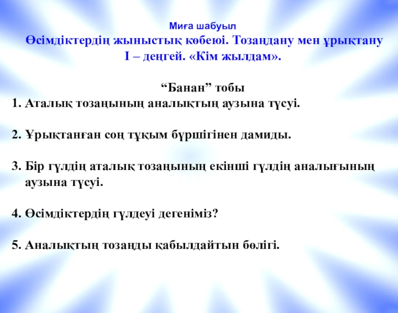 Жалпы мақсаттар:Оқушылар жасыл эвглена туралы оқиды, топта жұмыс жасап, мәтінді талдайды, қорытындылайды, формативті бағалайды.