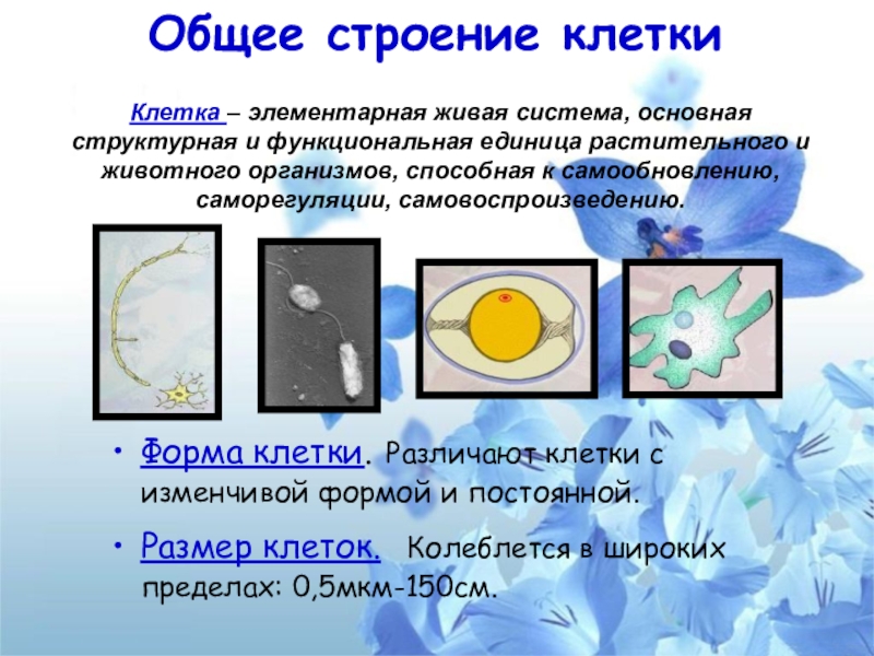 Клетка – элементарная живая система, основная структурная и функциональная единица растительного и животного организмов, способная к самообновлению, саморегуляции, самовоспроизведению.