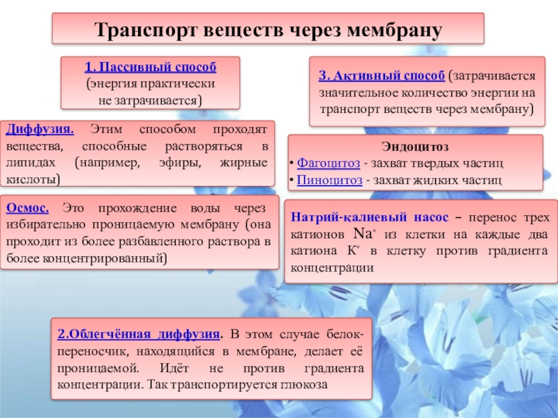 Натрий-калиевый насос – перенос трех катионов Na⁺ из клетки на каждые два катиона К⁺ в клетку против градиента концентрации