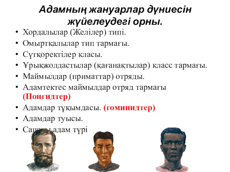 Адамның жануарлар дүниесін жүйелеудегі орны. Хордалылар (Желілер) типі.Омыртқалылар тип тармағы.Сүтқоректілер класы.Ұрықжолдастылар (қағанақтылар) класс тармағы.Маймылдар (приматтар) отряды.Адамтектес маймылдар