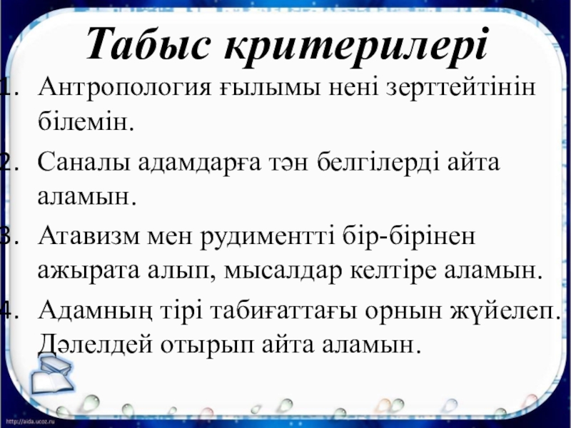 Табыс критерилеріАнтропология ғылымы нені зерттейтінін білемін.Саналы адамдарға тән белгілерді айта аламын.Атавизм мен рудиментті бір-бірінен ажырата алып, мысалдар