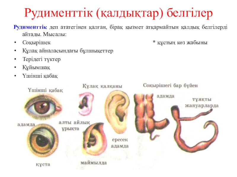 Рудименттік (қалдықтар) белгілерРудименттік деп ататегінен қалған, бірақ қызмет атқармайтын қалдық белгілерді айтады. Мысалы:Соқырішек