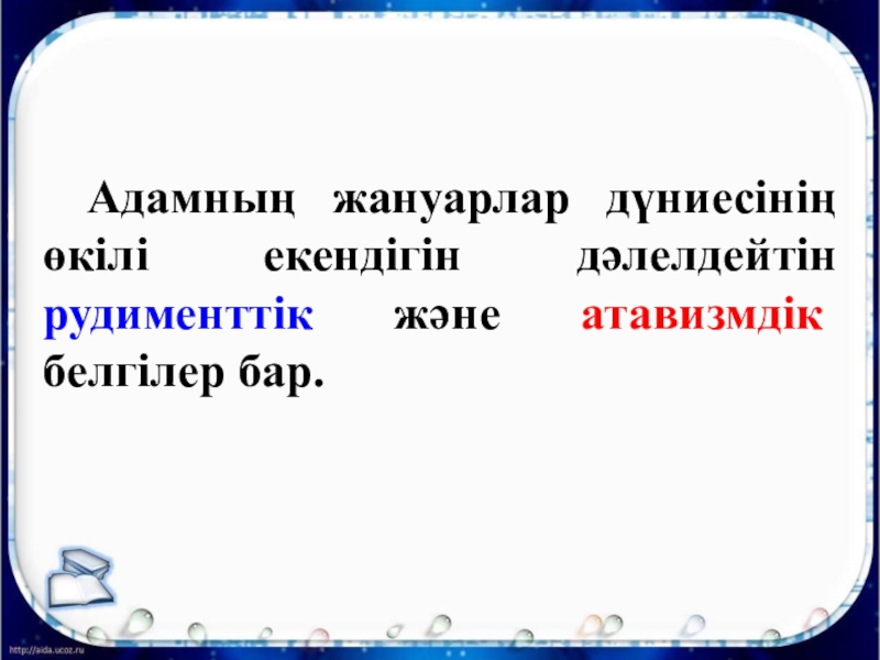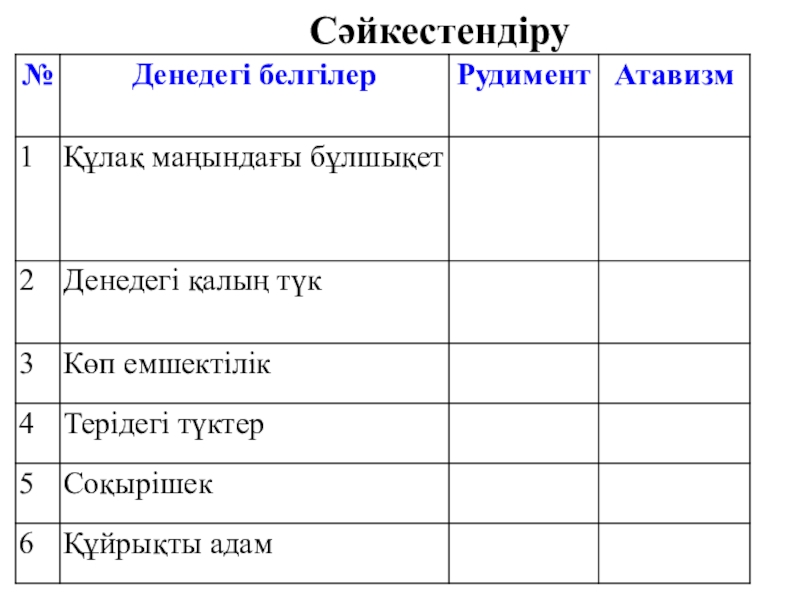 Слайд 13 Адамның жануарлар дүниесінің өкілі екендігін дәлелдейтін рудименттік және атавизмдік белгілер бар.