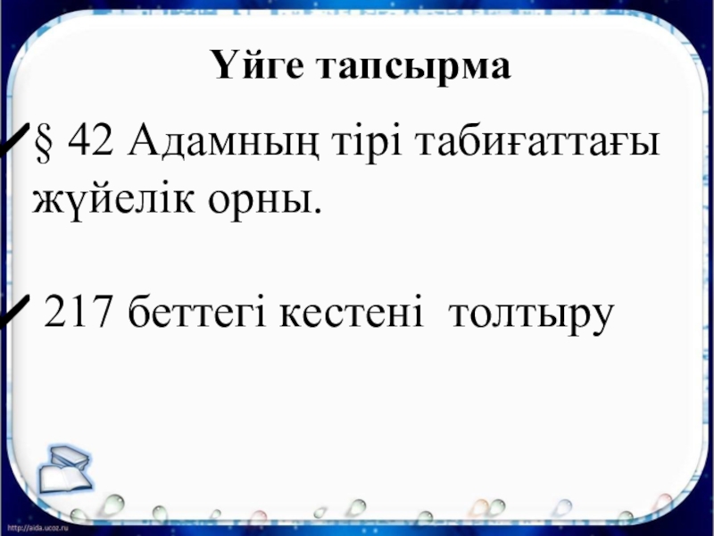 Үйге тапсырма § 42 Адамның тірі табиғаттағы жүйелік орны. 217 беттегі кестені толтыру