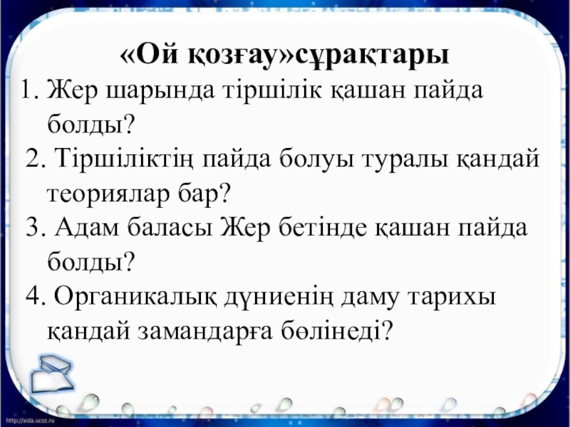 «Ой қозғау»сұрақтарыЖер шарында тіршілік қашан пайда болды?2. Тіршіліктің пайда болуы туралы қандай теориялар бар? 3. Адам баласы