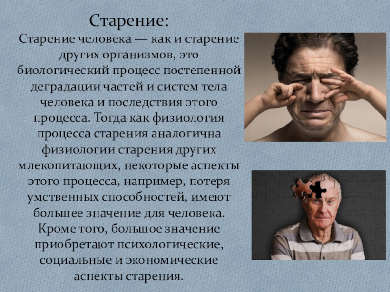 Слайд 6Старение: Старение человека — как и старение других организмов, это биологический процесс