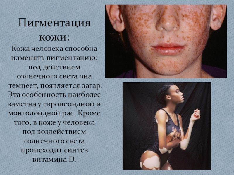 Слайд 3Пигментация кожи: Кожа человека способна изменять пигментацию: под действием солнечного света она