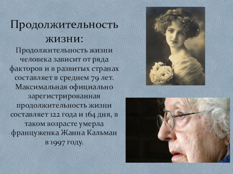 странах составляет в среднем 79 лет. Максимальная официально зарегистрированная продолжительность жизни составляет 122 года и 164 дня, в таком возрасте умерла француженка Жанна Кальман в 1997 году.
