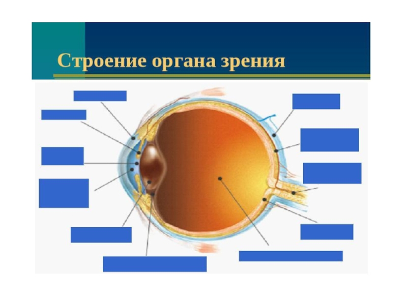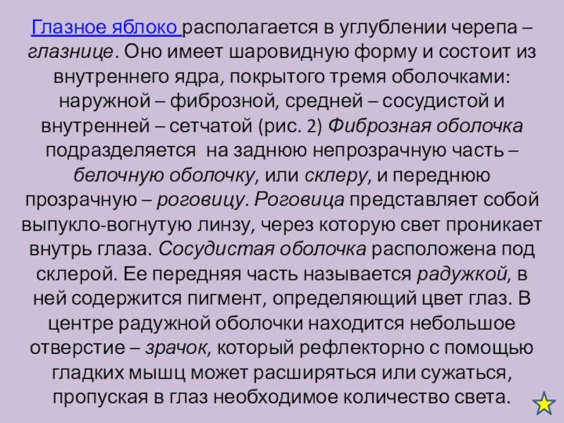 Слайд 7Глазное яблоко располагается в углублении черепа – глазнице. Оно имеет шаровидную