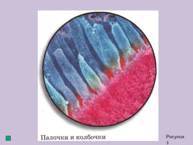 Непосредственно за зрачком находится двояковыпуклый хрусталик. Он может рефлекторно менять свою кривизну, обеспечивая четкое изображение на сетчатке – внутренней оболочке глаза. В сетчатке располагаются рецепторы (рис. 3): палочки (рецепторы сумеречного света, которые отличают светлое от темного) и колбочки (они обладают меньшей светочувствительностью, но различают цвета). Большинство колбочек размещается на сетчатке напротив зрачка, в желтом пятне. Рядом с этим пятном находится место выхода зрительного нерва, здесь нет рецепторов, поэтому его называют слепым пятном. Внутри глаз заполнен прозрачным и бесцветным стекловидным телом.