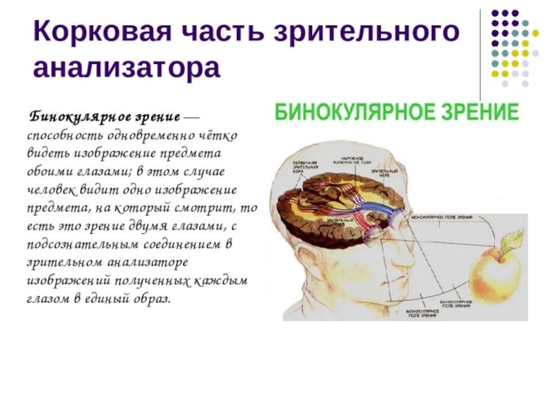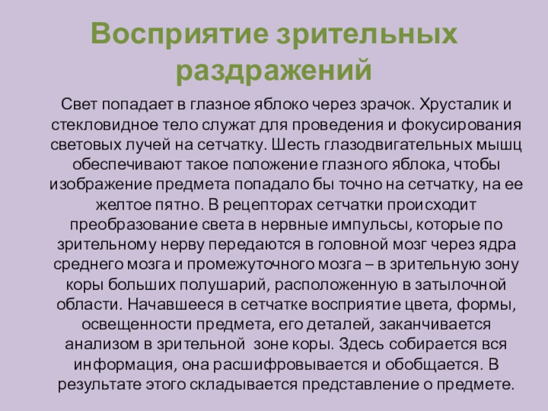 зрачок. Хрусталик и стекловидное тело служат для проведения и фокусирования световых лучей на сетчатку. Шесть глазодвигательных мышц обеспечивают такое положение глазного яблока, чтобы изображение предмета попадало бы точно на сетчатку, на ее желтое пятно. В рецепторах сетчатки происходит преобразование света в нервные импульсы, которые по зрительному нерву передаются в головной мозг через ядра среднего мозга и промежуточного мозга – в зрительную зону коры больших полушарий, расположенную в затылочной области. Начавшееся в сетчатке восприятие цвета, формы, освещенности предмета, его деталей, заканчивается анализом в зрительной зоне коры. Здесь собирается вся информация, она расшифровывается и обобщается. В результате этого складывается представление о предмете.