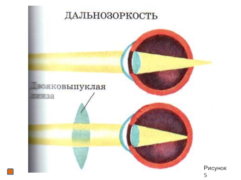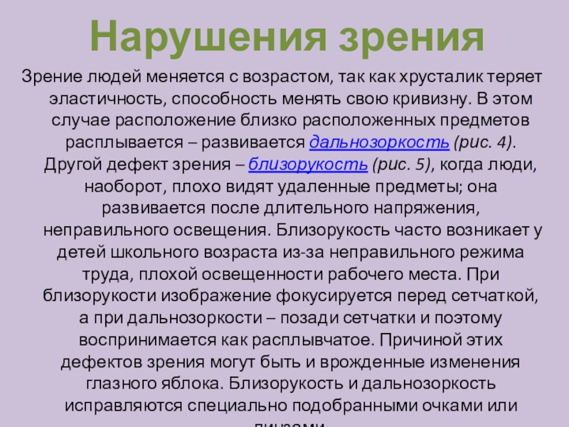 способность менять свою кривизну. В этом случае расположение близко расположенных предметов расплывается – развивается дальнозоркость (рис. 4). Другой дефект зрения – близорукость (рис. 5), когда люди, наоборот, плохо видят удаленные предметы; она развивается после длительного напряжения, неправильного освещения. Близорукость часто возникает у детей школьного возраста из-за неправильного режима труда, плохой освещенности рабочего места. При близорукости изображение фокусируется перед сетчаткой, а при дальнозоркости – позади сетчатки и поэтому воспринимается как расплывчатое. Причиной этих дефектов зрения могут быть и врожденные изменения глазного яблока. Близорукость и дальнозоркость исправляются специально подобранными очками или линзами.