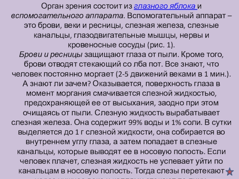 Орган зрения состоит из глазного яблока и вспомогательного аппарата. Вспомогательный аппарат