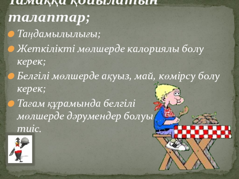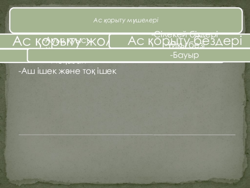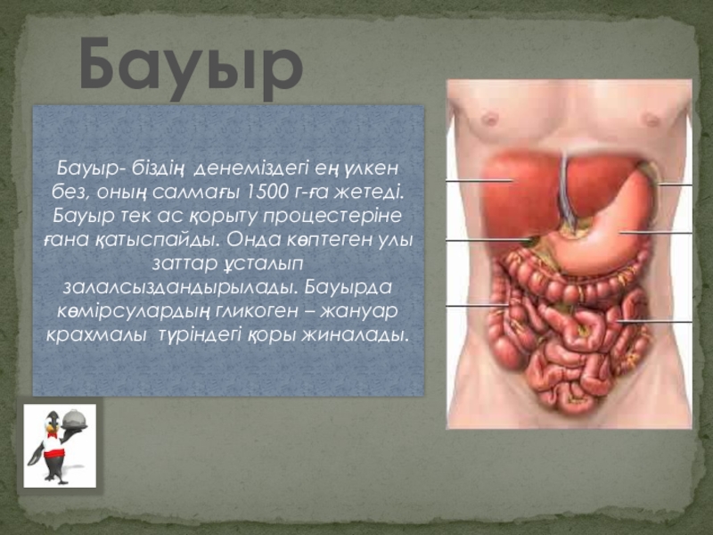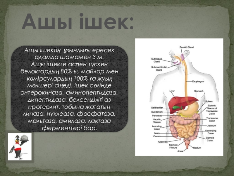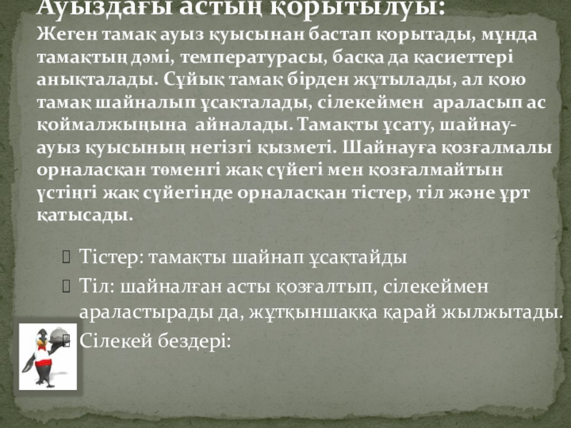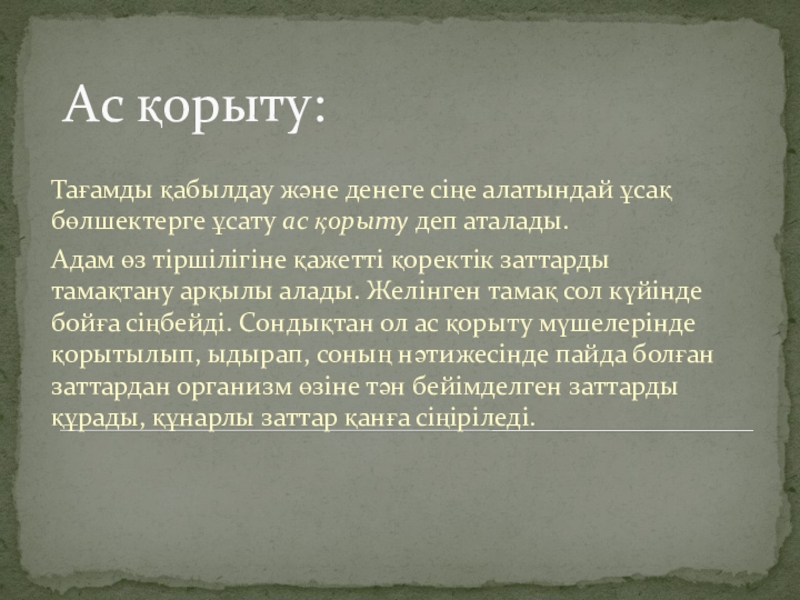 Жеген тамақ ауыз қуысынан бастап қорытады, мұнда тамақтың дәмі, температурасы, басқа да қасиеттері анықталады. Сұйық тамақ бірден жұтылады, ал қою тамақ шайналып ұсақталады, сілекеймен араласып ас қоймалжыңына айналады. Тамақты ұсату, шайнау- ауыз қуысының негізгі қызметі. Шайнауға қозғалмалы орналасқан төменгі жақ сүйегі мен қозғалмайтын үстіңгі жақ сүйегінде орналасқан тістер, тіл және ұрт қатысады.