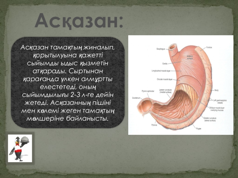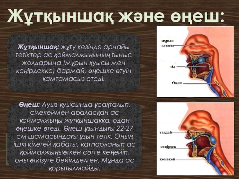 Өңеш: Ауыз қуысында ұсақталып, сілекеймен араласқан ас қоймалжыңы жұтқыншаққа, одан өңешке өтеді. Өңеш ұзындығы 22-27 см шамасындағы ұзын тетік. Оның ішкі кілегей қабаты, қатпарланып ас қоймалжыңыөткен сәтте кеңейіп, оны өткізуге бейімделген. Мұнда ас қорытылмайды.