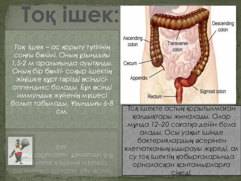 Тоқ ішекте астың қорытылмаған қалдықтары жиналады. Олар мұнда 12–20 сағатқа дейін бола алады. Осы уақыт ішінде бактериялардың әсерінен клетчатканың ыдырауы жүреді, ал су тоқ ішектің қабырғаларында орналасқан қантамырларға сіңеді.