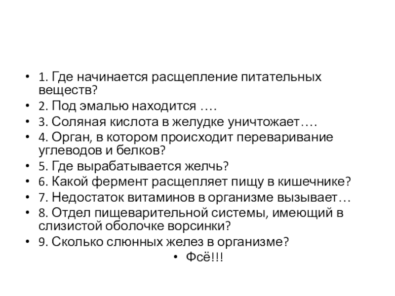 9. Под действием какого фермента происходит расщепление веществ в желудке?
