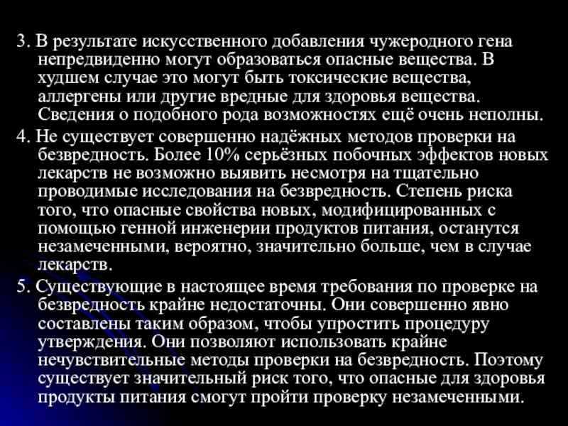 4. Не существует совершенно надёжных методов проверки на безвредность. Более 10% серьёзных побочных эффектов новых лекарств не возможно выявить несмотря на тщательно проводимые исследования на безвредность. Степень риска того, что опасные свойства новых, модифицированных с помощью генной инженерии продуктов питания, останутся незамеченными, вероятно, значительно больше, чем в случае лекарств.
