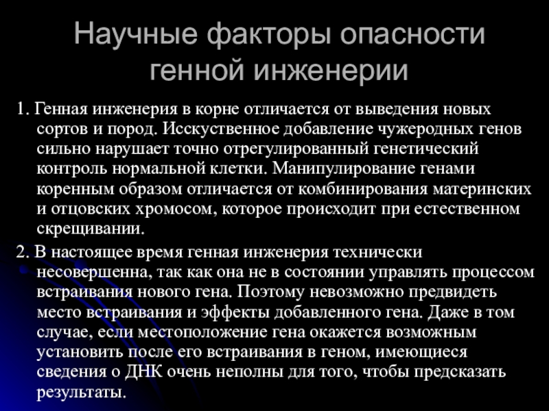 выведения новых сортов и пород. Исскуственное добавление чужеродных генов сильно нарушает точно отрегулированный генетический контроль нормальной клетки. Манипулирование генами коренным образом отличается от комбинирования материнских и отцовских хромосом, которое происходит при естественном скрещивании.