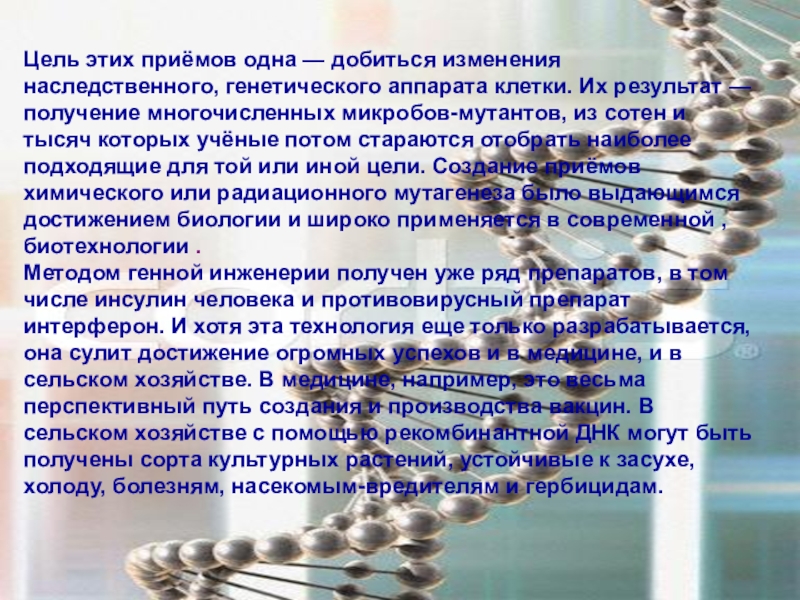 Методом генной инженерии получен уже ряд препаратов, в том числе инсулин человека и противовирусный препарат интерферон. И хотя эта технология еще только разрабатывается, она сулит достижение огромных успехов и в медицине, и в сельском хозяйстве. В медицине, например, это весьма перспективный путь создания и производства вакцин. В сельском хозяйстве с помощью рекомбинантной ДНК могут быть получены сорта культурных растений, устойчивые к засухе, холоду, болезням, насекомым-вредителям и гербицидам.