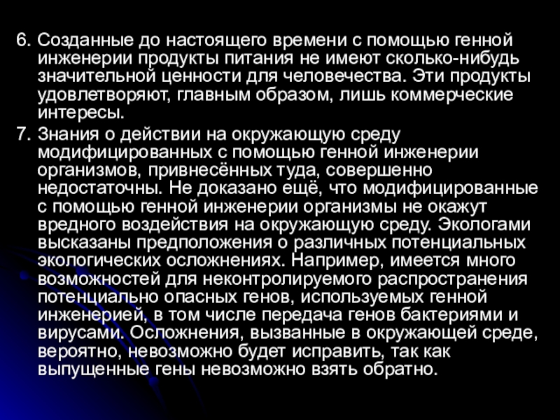 7. Знания о действии на окружающую среду модифицированных с помощью генной инженерии организмов, привнесённых туда, совершенно недостаточны. Не доказано ещё, что модифицированные с помощью генной инженерии организмы не окажут вредного воздействия на окружающую среду. Экологами высказаны предположения о различных потенциальных экологических осложнениях. Например, имеется много возможностей для неконтролируемого распространения потенциально опасных генов, используемых генной инженерией, в том числе передача генов бактериями и вирусами. Осложнения, вызванные в окружающей среде, вероятно, невозможно будет исправить, так как выпущенные гены невозможно взять обратно.