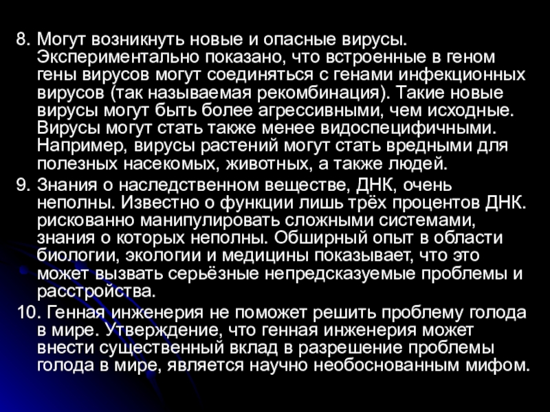 9. Знания о наследственном веществе, ДНК, очень неполны. Известно о функции лишь трёх процентов ДНК. рискованно манипулировать сложными системами, знания о которых неполны. Обширный опыт в области биологии, экологии и медицины показывает, что это может вызвать серьёзные непредсказуемые проблемы и расстройства.