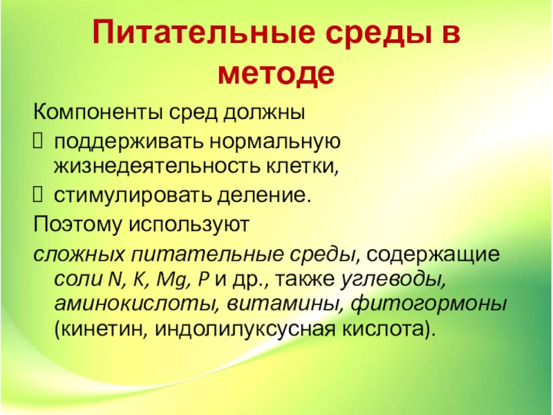 сложных питательные среды, содержащие соли N, K, Mg, P и др., также углеводы, аминокислоты, витамины, фитогормоны (кинетин, индолилуксусная кислота).